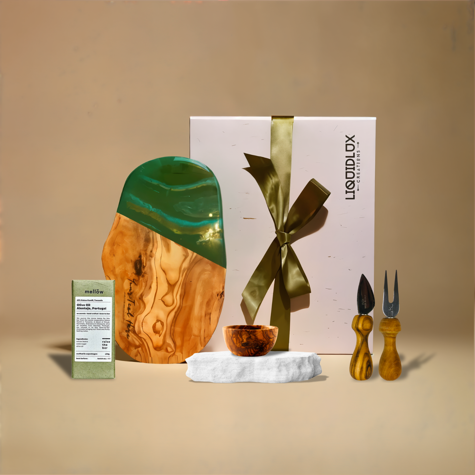 Ontworpen voor momenten van verwennerij en vreugde, combineert onze milieuvriendelijke cadeauset de fijnste duurzaam geproduceerde materialen met doordacht, ambachtelijk design. Het middelpunt van deze set is een prachtig klein olijfhouten serveerplankje, afgewerkt met met de hand gegoten epoxy. Elk stuk is uniek, met natuurlijke houtnerven en een organische vorm die behouden blijft.