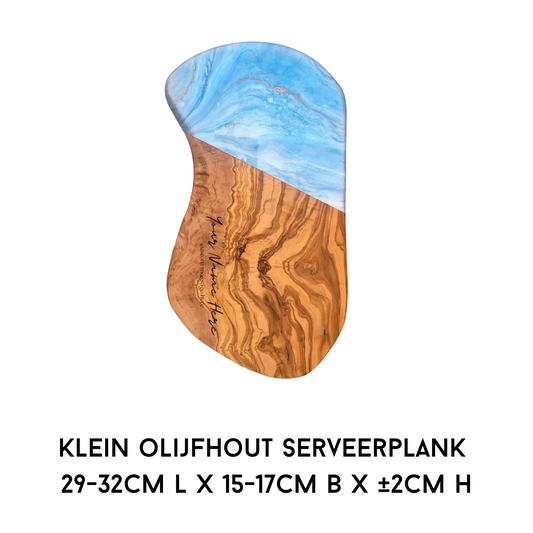 - Klein Olijfhout Hars Serveerplank: 29-32cm L x 15-17cm B x ±2cm H (Afmetingen en vormen kunnen variëren door de natuurlijke vorm van het hout)
